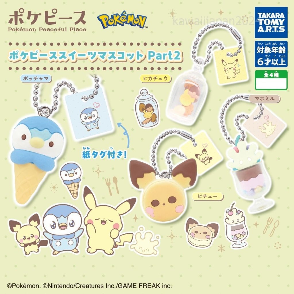 Pokémon Peaceful Place sweets mascot, Pokémon dessert gashapon, Pikachu lollipop keychain, Rowlet pancake charm, Scorbunny ice cream float toy, Espurr jelly dessert figure, Pokémon A.R.T.S gashapon series, cute Pokémon capsule toy 2024, Takara Tomy Pokémon pastel merch, Pokémon snack keychains Japan